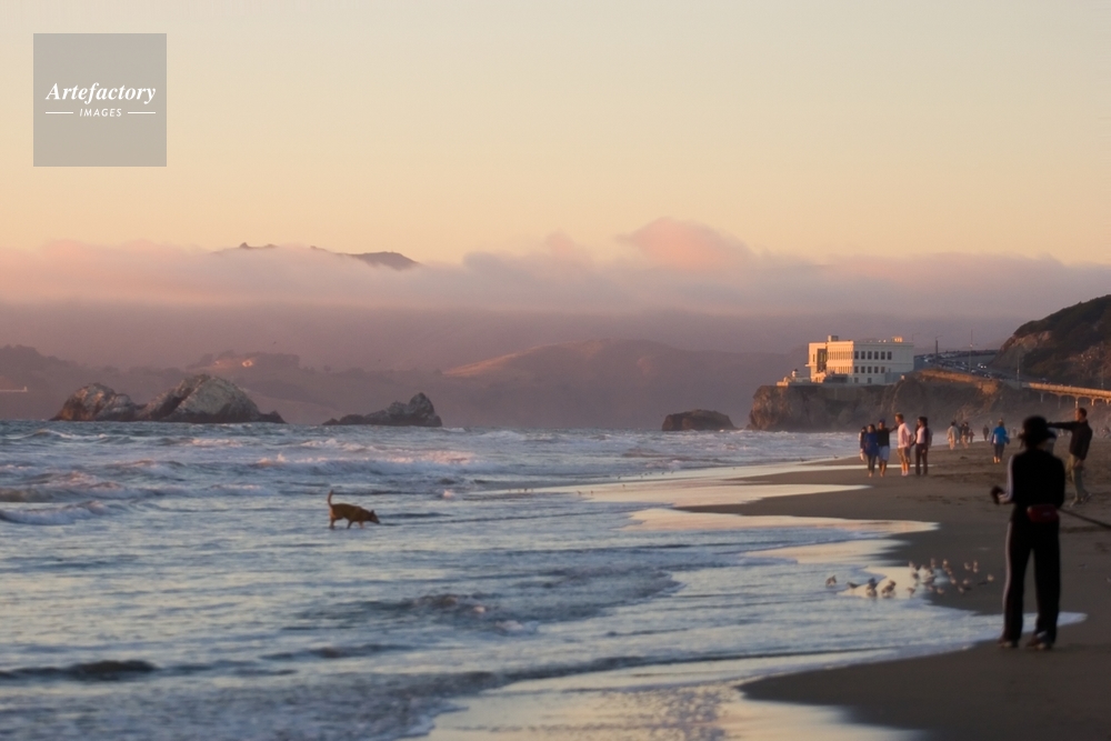 | キャプション | People and a dog enjoy the water at Ocean Beach in San Francisco. The setting sun reflects off the Cliff House and Marin Headlands in this shot from last night. | 制限事項 | ||