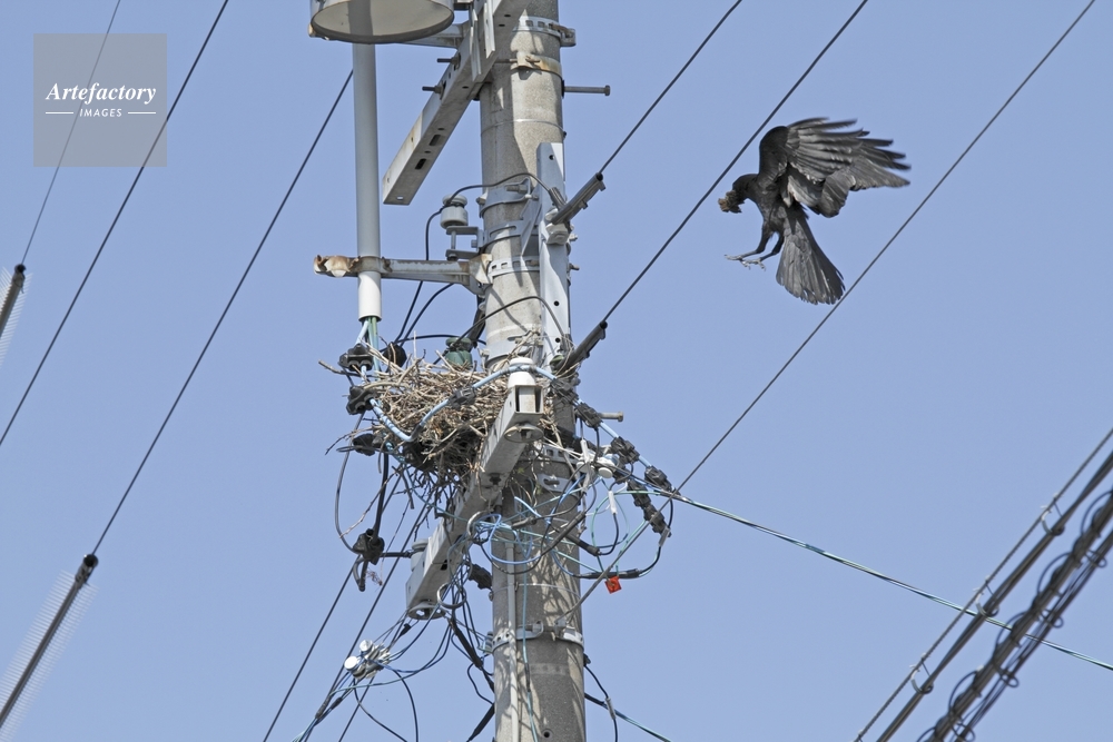 | 作品タイトル | ハシボソガラス、電柱の巣に巣材を運ぶ | モデルリリース | なし | |
