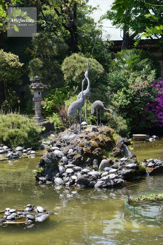 | キャプション | 鶴の噴水の根元で日光浴をするカメ | 制限事項 | ||