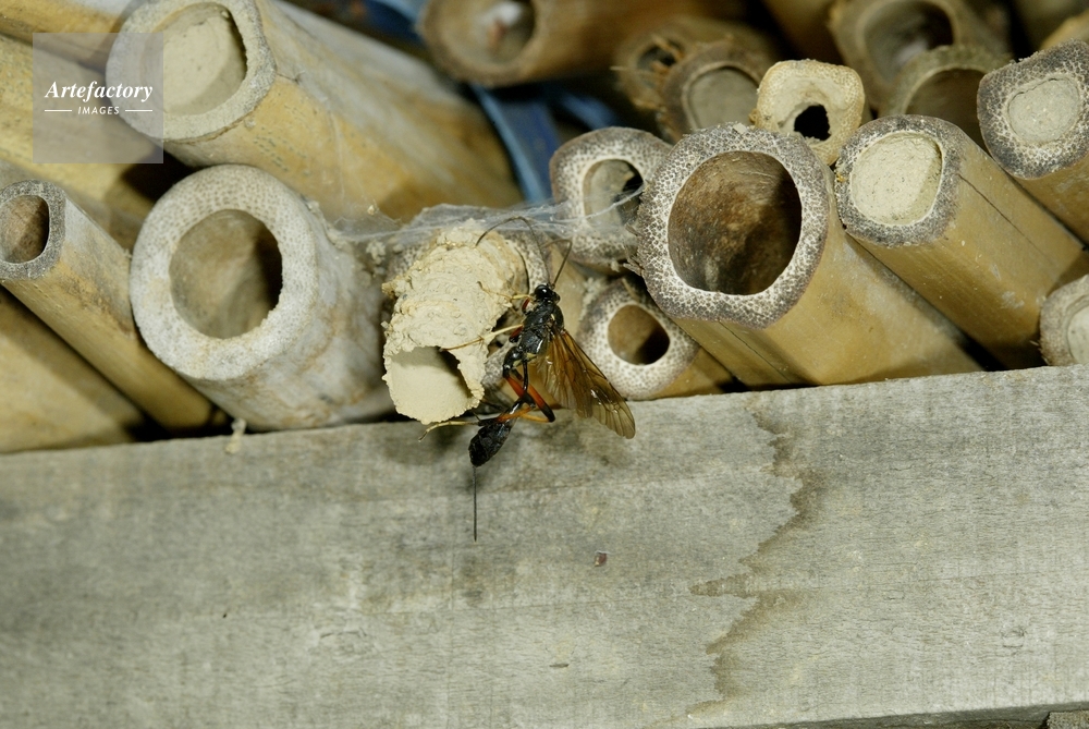| キャプション | オオカバフスジドロバチの巣のようすを探る、寄生蜂 | 制限事項 | ||