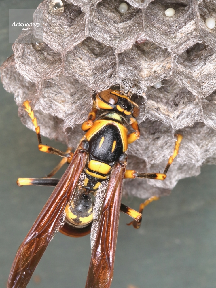 | キャプション | 巣内の様子を見る女王 白いのは卵 液滴は貯蜜 スズメバチ科 | 制限事項 | ||