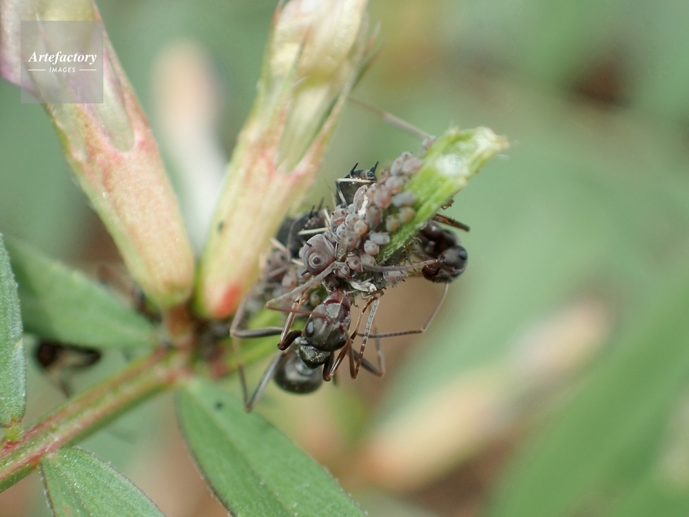 | キャプション | カラスノエンドウにたかるマメアブラムシから甘露を受け取る アリ科 | 制限事項 | ||