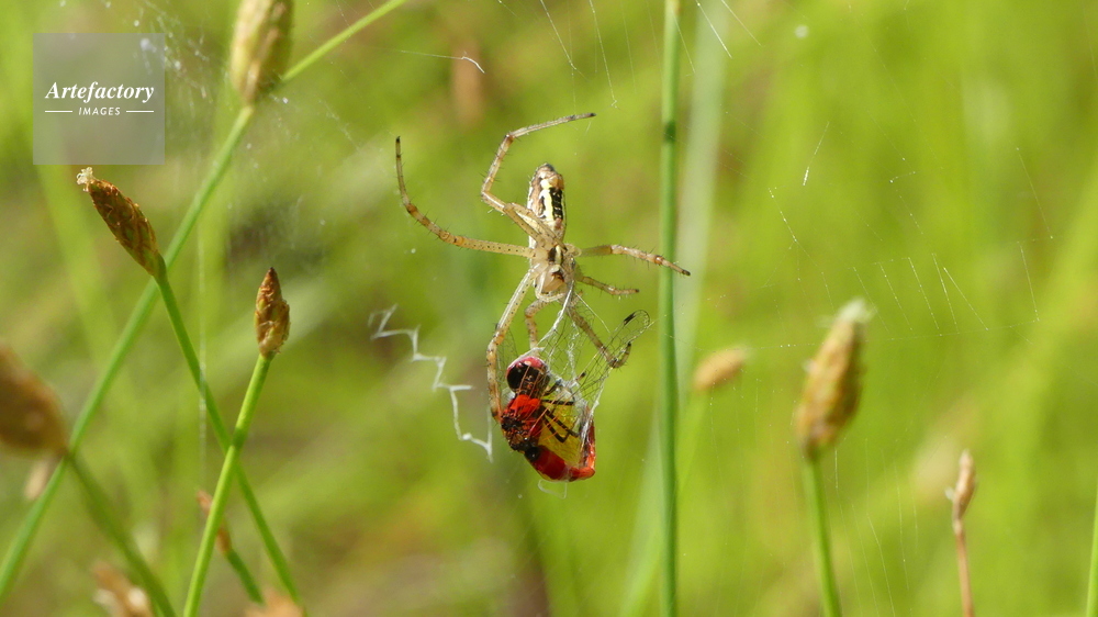 | キャプション | ナガコガネグモの巣にかかる トンボ科 | 制限事項 | ||