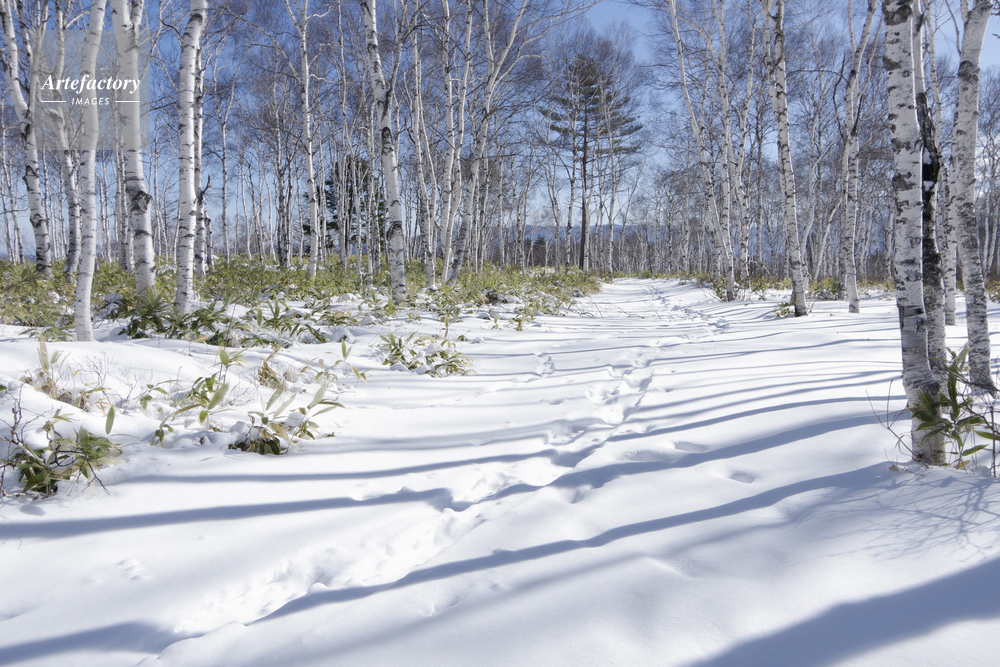 | 作品タイトル | 雪の白樺の森へと続くスノウシューズのトレース | モデルリリース | なし | |