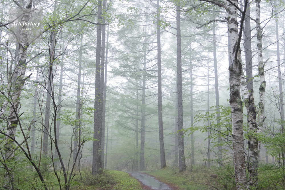| 作品タイトル | 霧の針葉樹の森へと続く遊歩道 | モデルリリース | なし | |