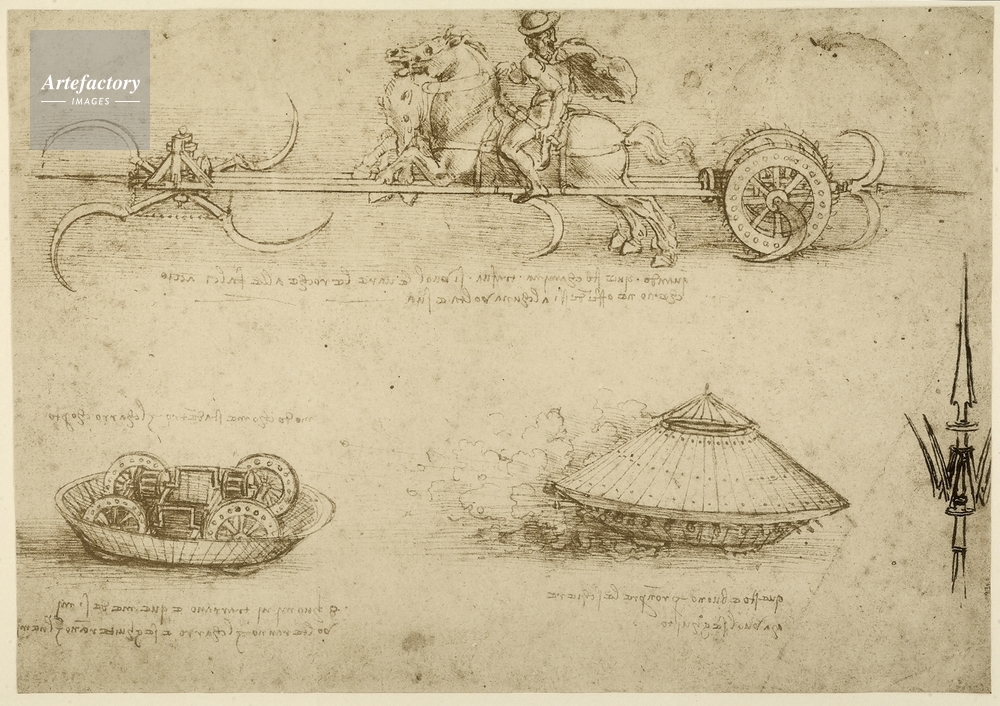 | キャプション | Study for war machines: a scythed chariot, an armored car, and a machine with a halberd; pen drawing on yellowed paper, British Museum, London | 制限事項 | 商用または広告使用については許諾が必要となりますので、お問合せ願います。 | |