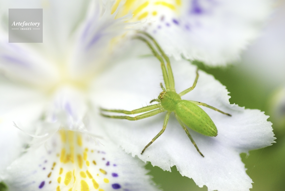 | キャプション | クモ、緑色,シャガの花で獲物を待つ | 制限事項 | ||