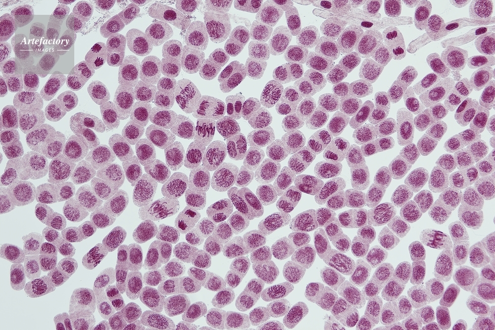 | キャプション | 体細胞分裂のいろいろな時期 酢酸オルセイン染色、長辺35mmの場合 50倍 | 制限事項 | ||