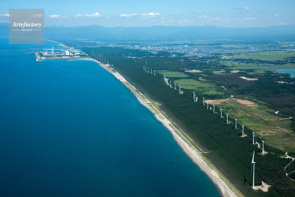 | 作品タイトル | 能代の防風林と風力発電施設群と海岸線(浅内より能代市街地) | モデルリリース | なし | |