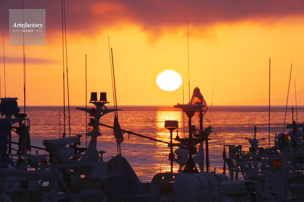 | 作品タイトル | 羅臼港の日の出と漁船 | モデルリリース | なし | |