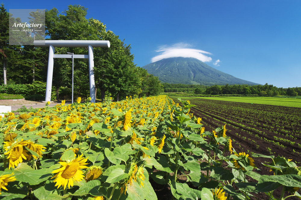 | 作品タイトル | 真狩神社のヒマワリ畑と羊蹄山とかさ雲 | モデルリリース | なし | |