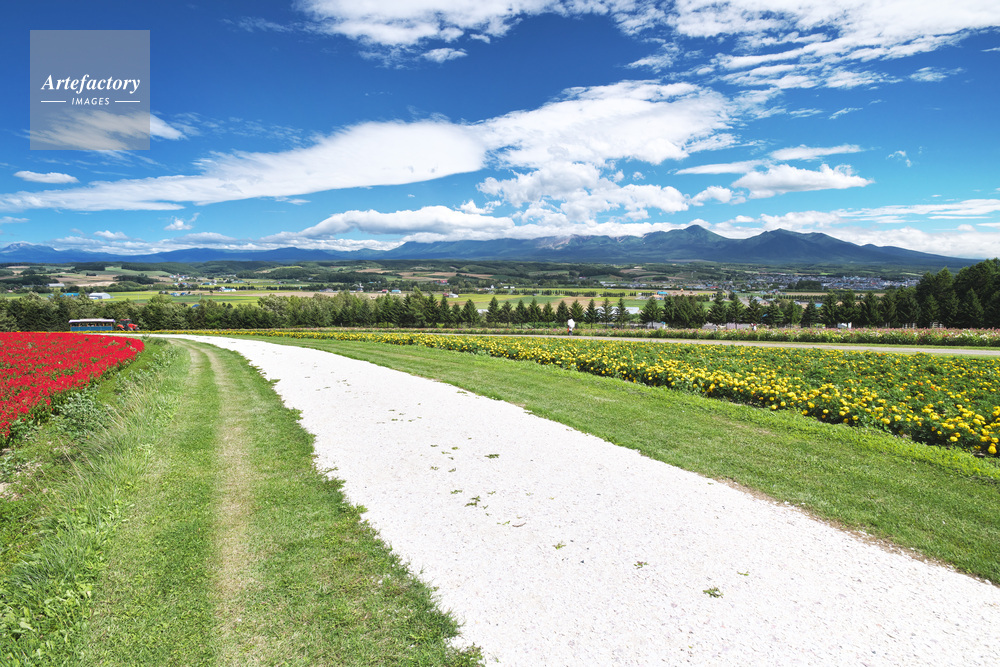 | 作品タイトル | フラワーランド ヘブンロード白い道と十勝岳連峰 | モデルリリース | なし | |