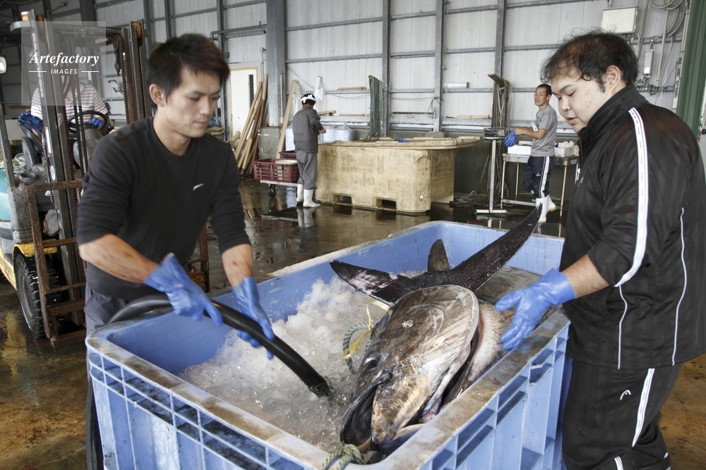 | 作品タイトル | マグロ水揚げ、氷詰めして保管、出荷 | モデルリリース | なし | |