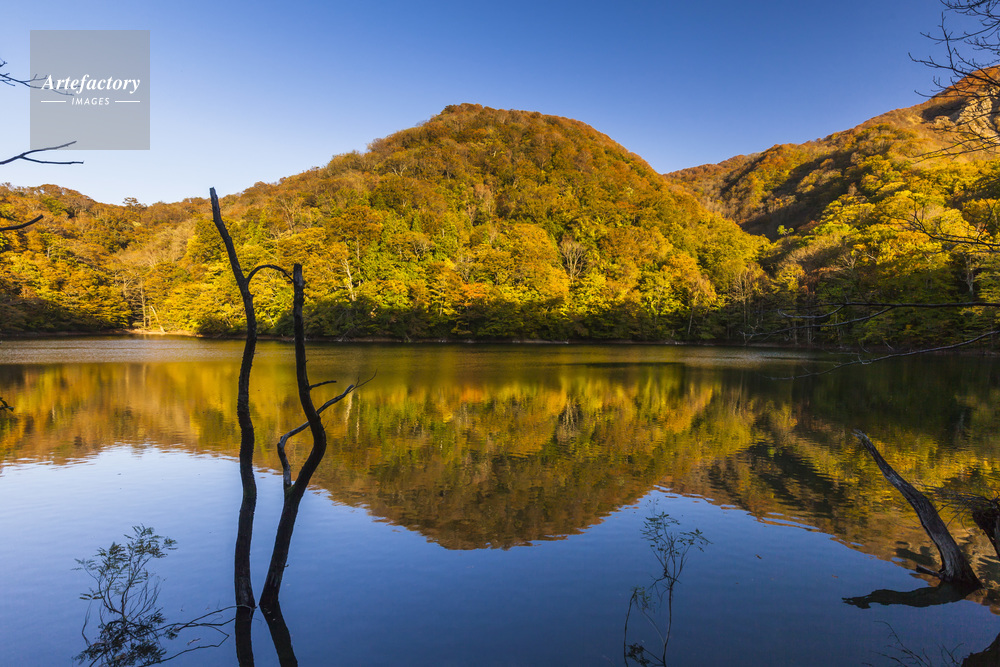 | 作品タイトル | 津軽国定公園十二湖の鶏頭場ノ池と紅葉 | モデルリリース | なし | |
