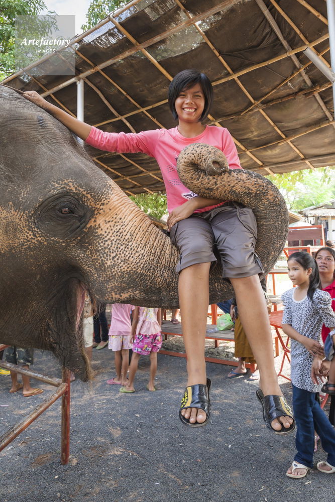 | キャプション | ゾウのショー ゾウの鼻に乗る観光客の女性 | 制限事項 | ||
