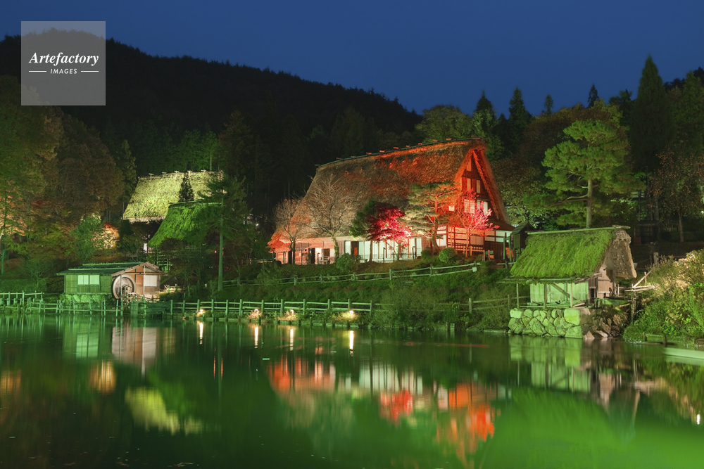| キャプション | 紅葉 合掌造 秋 池 写りこみ 水車 ライトアップ 飛騨の里 | 制限事項 | ||