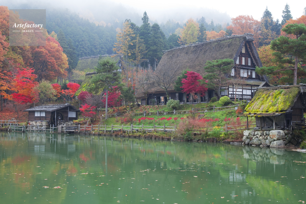 | キャプション | 紅葉 合掌造 秋 池 写りこみ 水車 飛騨の里 | 制限事項 | ||