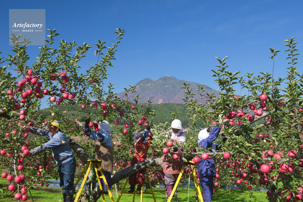 | 作品タイトル | リンゴの収穫風景と岩木山 | モデルリリース | あり | |