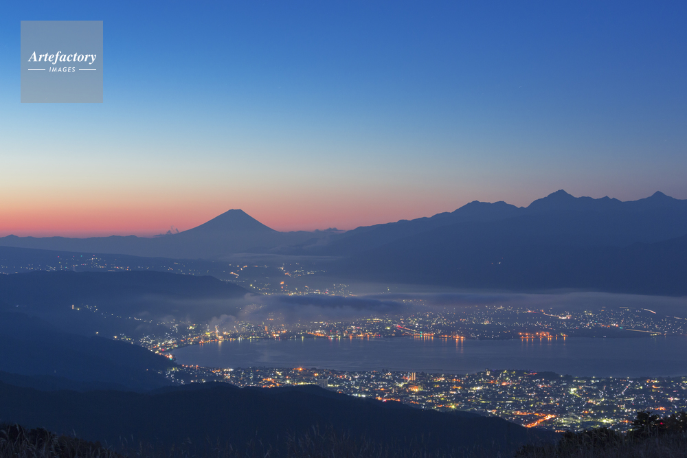 | 作品タイトル | 朝焼けの富士山と諏訪湖 | モデルリリース | なし | |