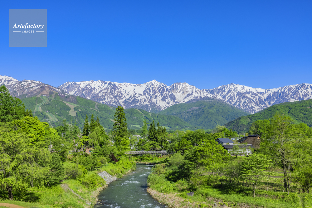 | 作品タイトル | 新緑の大出公園と姫川と残雪の白馬三山 | モデルリリース | なし | |