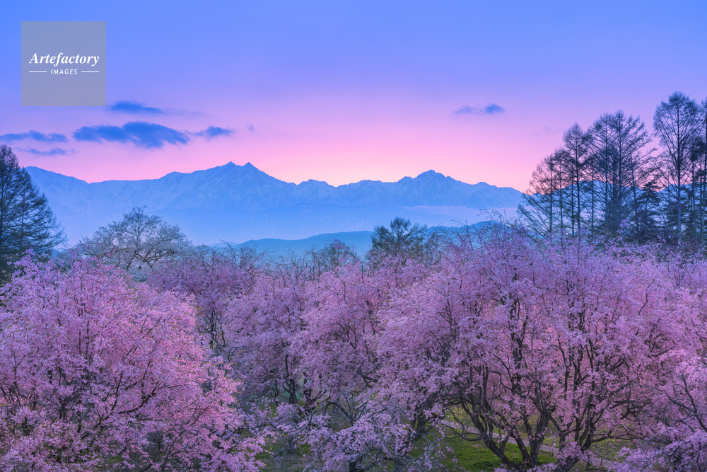 | 作品タイトル | 夕景の小川村の桜と北アルプス | モデルリリース | なし | |