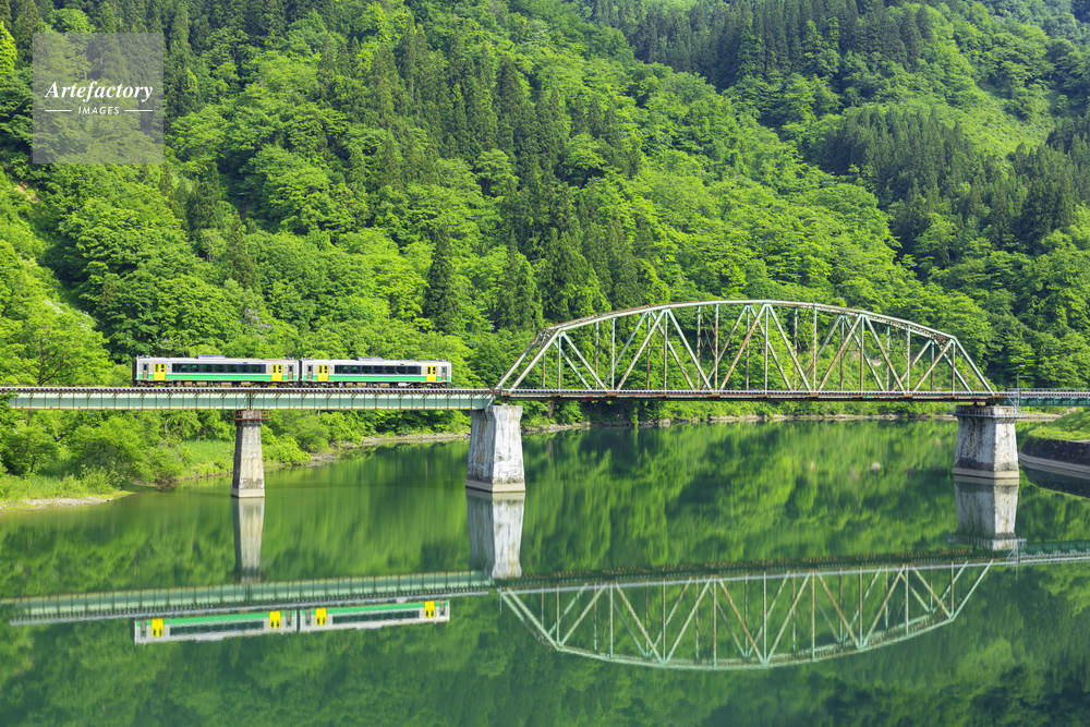 | 作品タイトル | 川面に映る新緑と只見線 | モデルリリース | なし | |