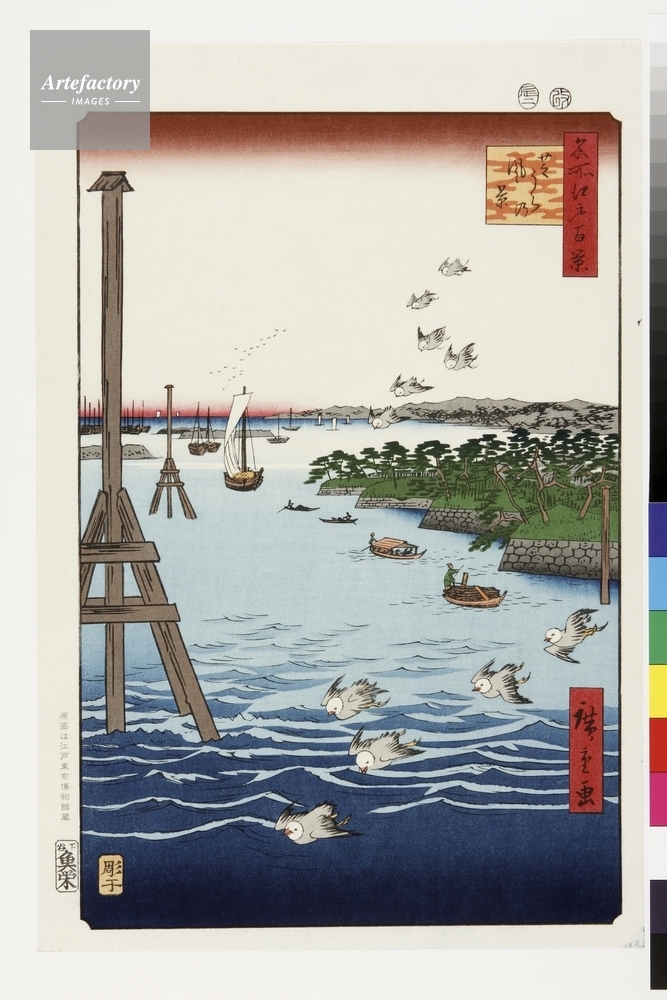 | キャプション | 浮世絵復刻版画 / 現在の浜離宮庭園の沖から品川方向を望んだ図。この庭園は「御浜御殿」と呼ばれた将軍の別荘があった場所だ。戦後米軍に破壊され、返還後に現在のかたちに修復された。左端には潮の干満を知らせるための澪標が描かれている。 | 制限事項 | ||