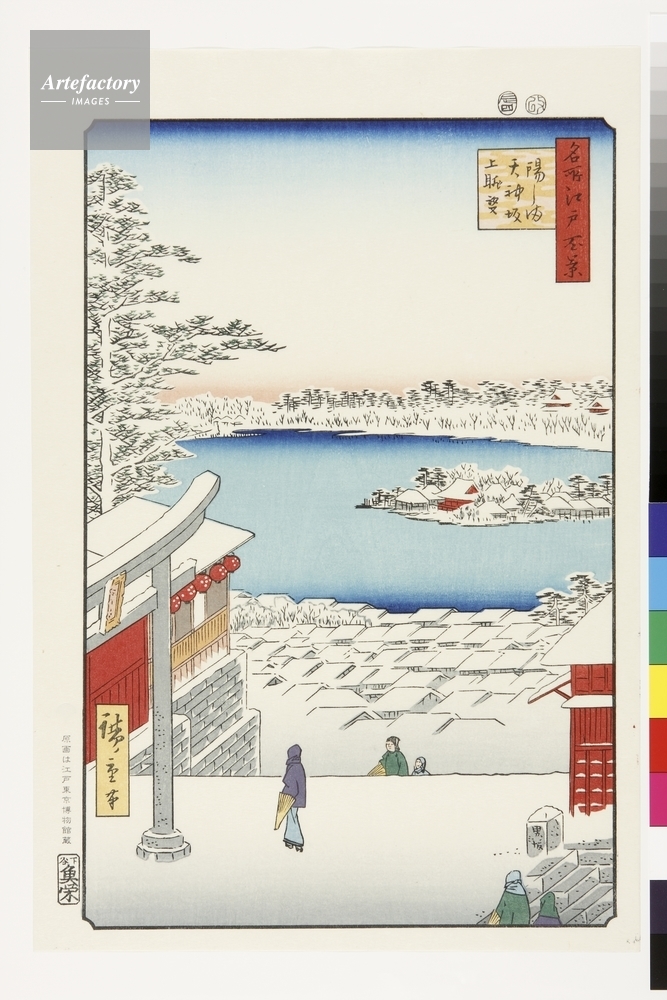 | キャプション | 浮世絵復刻版画 / 湯島天神の境内は高台にあり、そこからの不忍池方向の眺めは素晴らしかった。男坂、女坂共に現在でもあるが描かれたのは女坂の方である。境内には芝居小屋や茶店等が立ち並び、江戸市民の娯楽地として賑わいをみせた。 | 制限事項 | ||