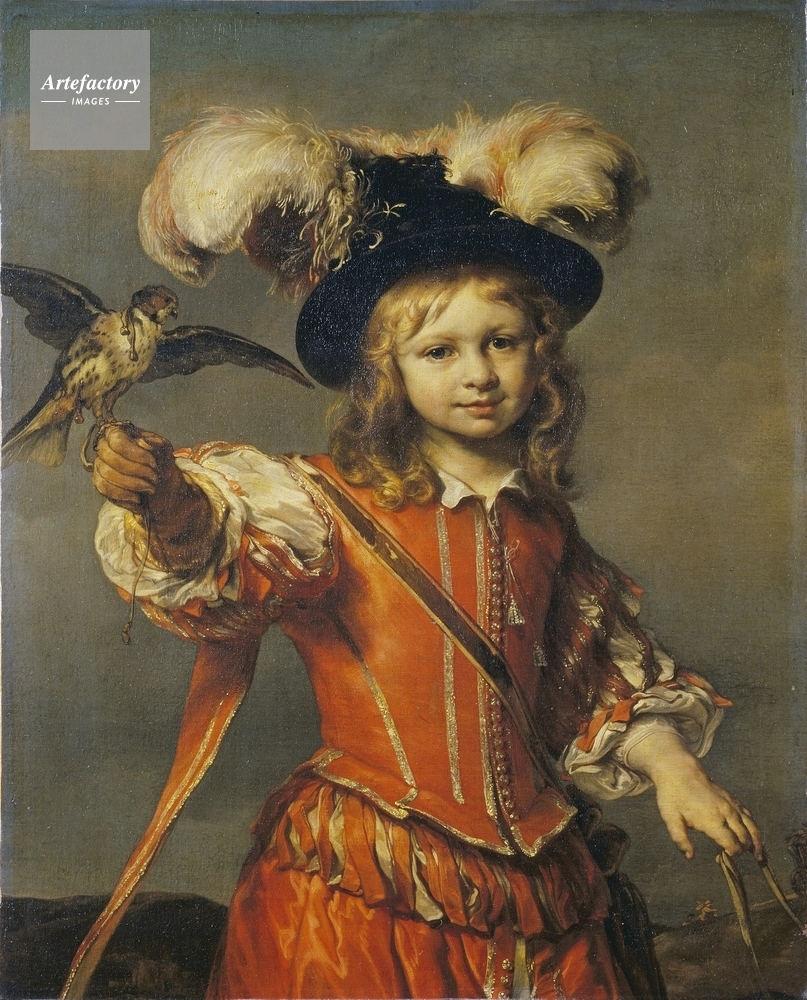 | キャプション | A young boy, shown three-quarter length, with fair hair and grey eyes. He wears a black hat with white plumes and a red suit. He holds a hooded falcon in his outstretched right hand. | 制限事項 | ||