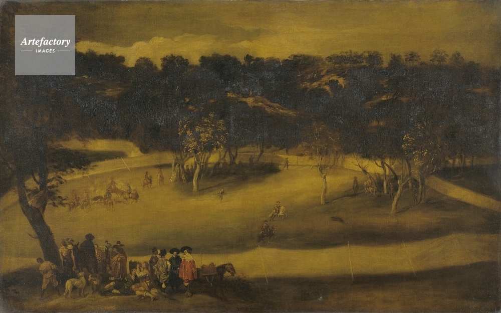 | キャプション | The hunting of wild boar in the Royal Enclosure. Hounds and huntsmen are visible in the distance on the left, and another group of figures can be seen in the left foreground. | 制限事項 | ||