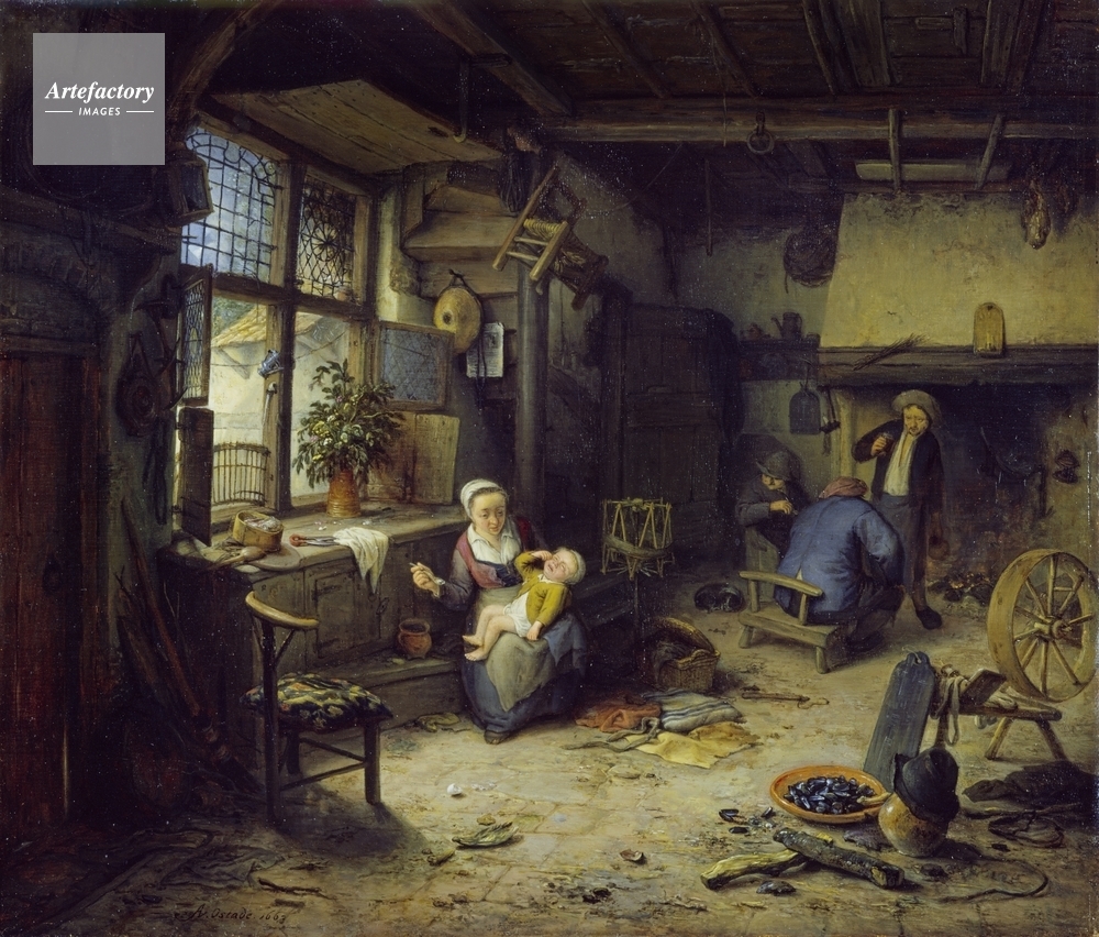 | キャプション | The interior of a cottage. In the centre middle-ground, a peasant woman is seated feeding her child. To the right on the floor are mussel and egg shells, and a spinning wheel and a wool-winding frame stand to the centre of the room. | 制限事項 | ||
