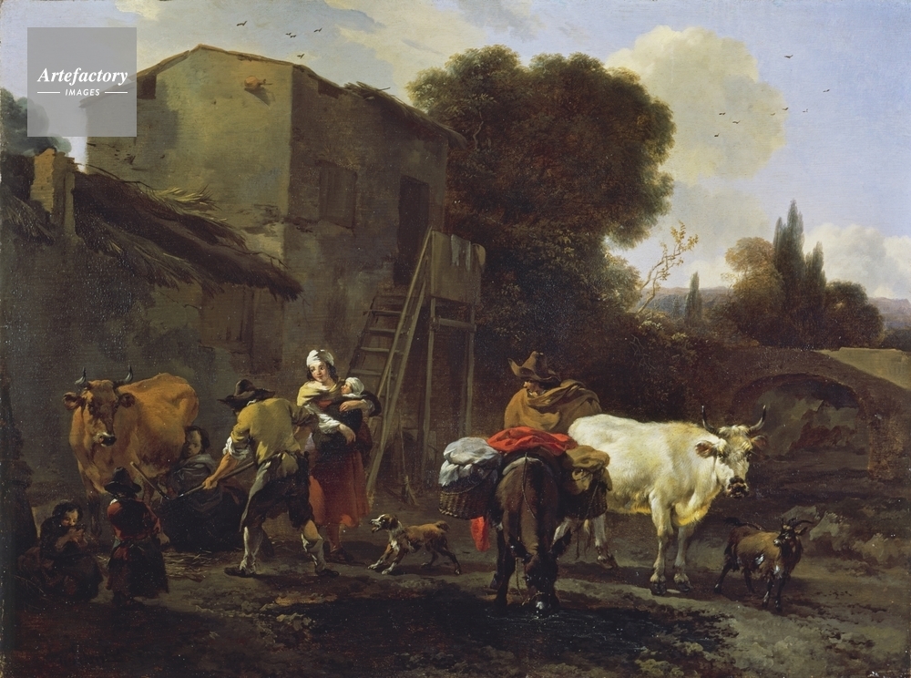 | キャプション | People with cattle in an Italianate landscape. The donkey in the centre has a red saddle-cloth and the woman holding the child on the right wears a red brick skirt. There are farm buildings and trees behind them. | 制限事項 | ||