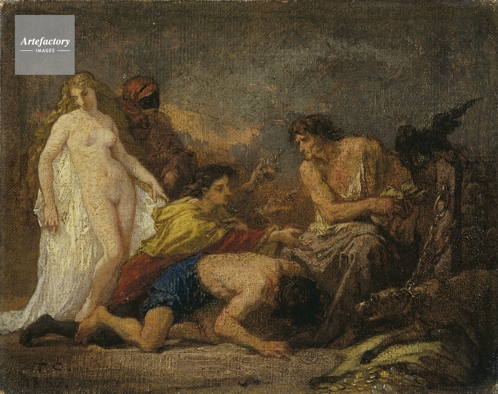 | キャプション | An allegory of greed derived from Shakespeare's 'Timon of Athens'. Timon is on the right. The kneeling figure in the centre is in red and yellow while a figure behind offers a sword. A naked girl on the left beside a courtier wearing red and a black mask. | 制限事項 | ||