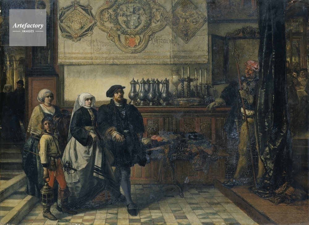 | キャプション | The artist Frans Floris (1519-20-70) with his wife and servants in a richly furnished interior. The servant boy carries a rapier, lute and lantern. The painted banner of the guild of St. Luke hangs on the facing wall. | 制限事項 | ||