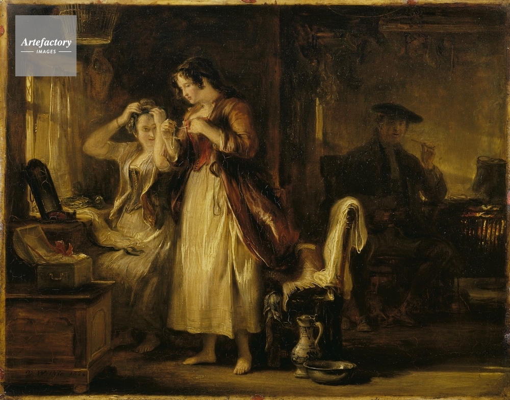 キャプション | Two ladies at their toilet with a man (Glaud) smoking a pipe. The woman who is standing (Peggy) wears a red bodice and purple coat, while the seated woman (Jenny) wears a pale blue bodice. From Allan Ramsay's poem 'The Gentle Shepherd', V. | 制限事項 | ||