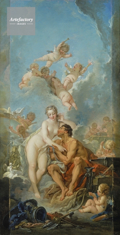 | キャプション | Forms a set with P438 and P444. Vulcan, seated in his forge, gazes up at his standing naked wife Venus. Amours play with the instruments of Vulcan's workshop and the fires of love. A pile of armour lies bottom left. | 制限事項 | ||