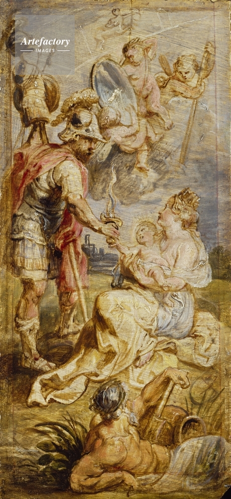 | キャプション | Mars, on the left, presents a sword to the infant Henry IV who is being nursed by a woman symbolizing the city of Pau. At the top of the painting, Sagittarius, the zodiac symbol for December, appears in the sky. | 制限事項 | ||