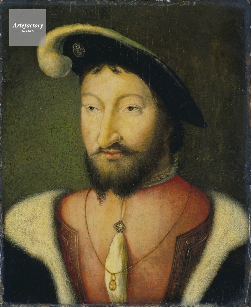 | キャプション | Portrait of François Ier, King of France (1494-1547). He wears a black hat with a jewel and a white plume, a red jacket over a pink doublet, and a dark fur-lined cloak. A weak copy of a type found in many versions. | 制限事項 | ||