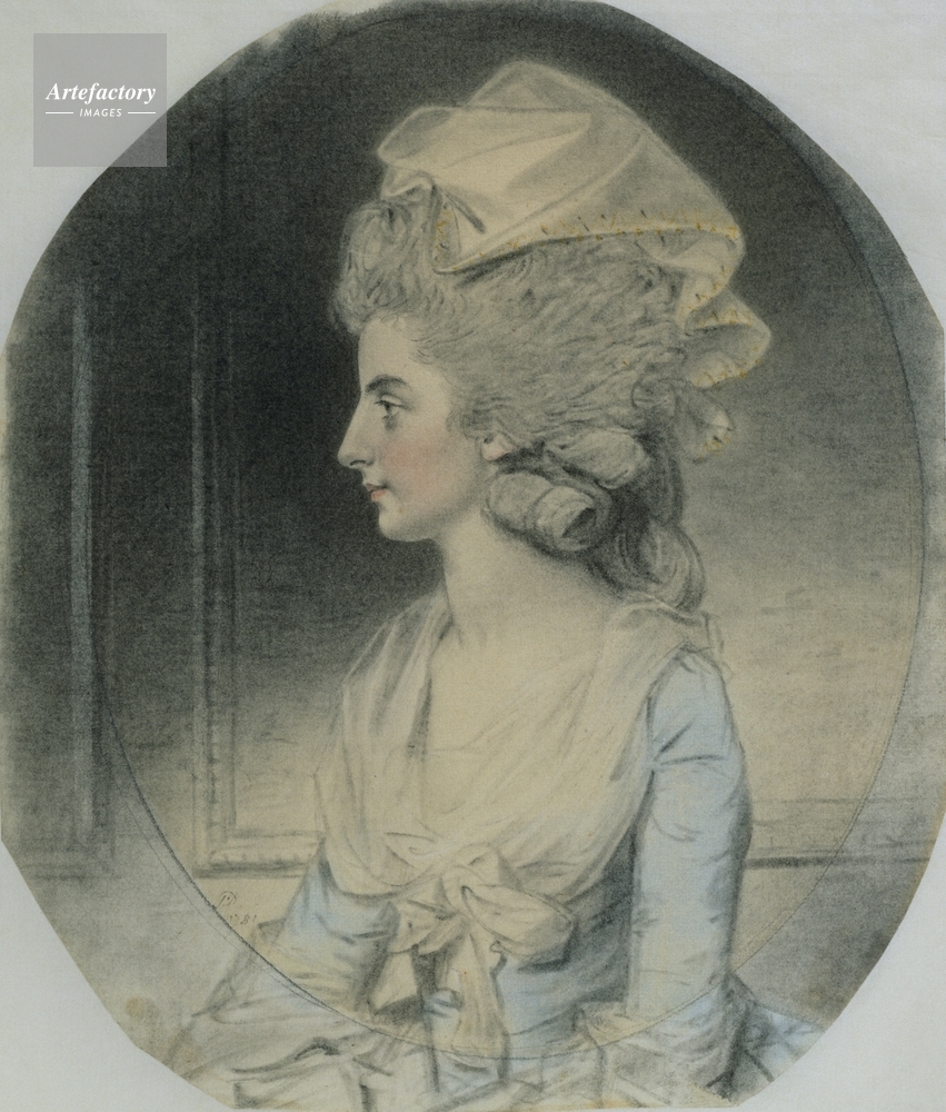 | キャプション | Half-length oval portrait of a lady with the face in profile to the left. She has powdered hair and is dressed in a white kerchief and a light blue dress. | 制限事項 | ||