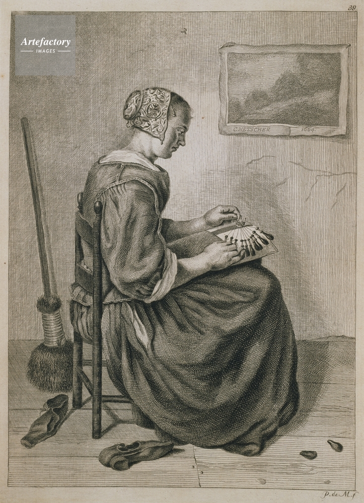 | キャプション | A woman seated in her room making lace. Her shoes are on the floor on the left. A Dutch print hangs on the wall and a broom is on the left. After P237 by Caspar Netscher. | 制限事項 | ||