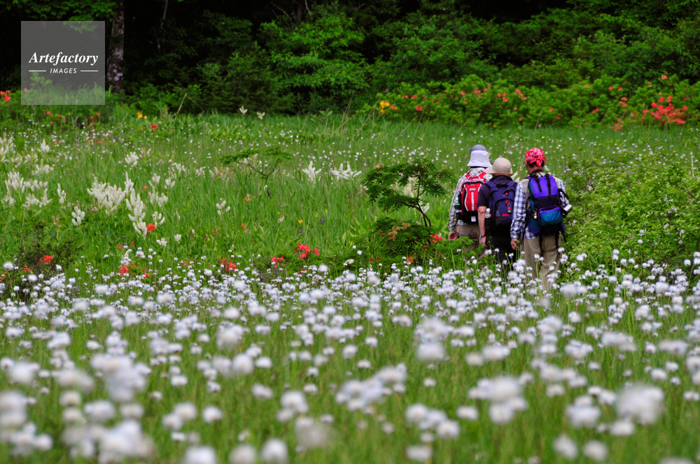 | 作品タイトル | 駒止湿原のワタスゲ群生とハイカー | モデルリリース | なし | |
