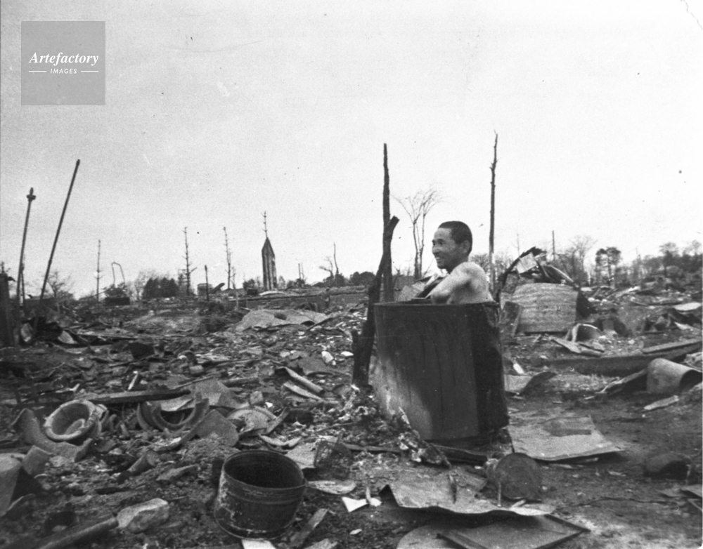 | キャプション | アメリカ軍爆撃機の空襲で一面焼け野原となった東京で、入浴する空襲被災者=1945年3月撮影 | 制限事項 | ||