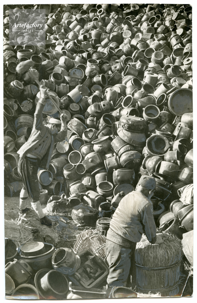| キャプション | 第2回金属回収運動で供出された火鉢の山。運搬のため、ハンマーでつぶしている | 制限事項 | ||