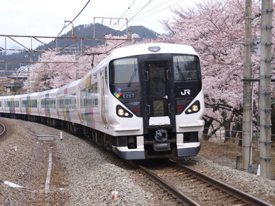 甚六桜咲く中央本線 スーパーあずさ 勝沼ぶどう郷駅