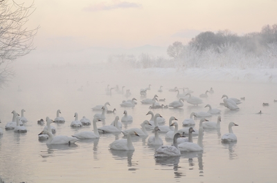 屈斜路湖の砂湯に集まるオオハクチョウ