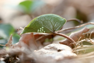 ヒメカンアオイの葉に産み付けられたギフチョウの卵 「ギフチョウとヒメギフチョウ」