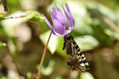 カタクリの花の蜜を吸うヒメギフチョウ 「ギフチョウとヒメギフチョウ」