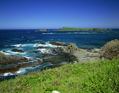 ヨツバシオガマ咲くスコトン岬からトド島。礼文島