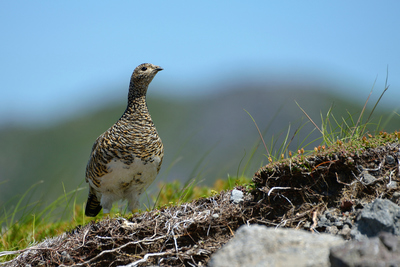 ハイマツの中から周囲を警戒するライチョウのメス