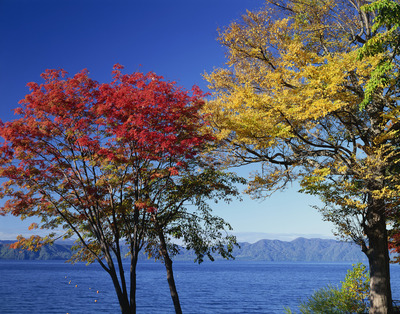 紅葉に彩られる支笏湖